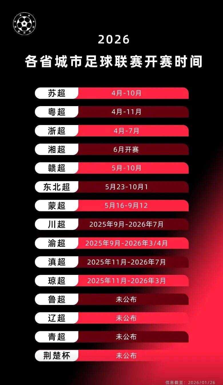 苏超、浙超(城市争霸赛)4月启战,赣超、蒙超5月开打,首届东北超5月23日揭幕,湘超6月开启常规赛,粤超也在积极筹划中。渝超、琼超、滇超等跨年赛事正火热进行。